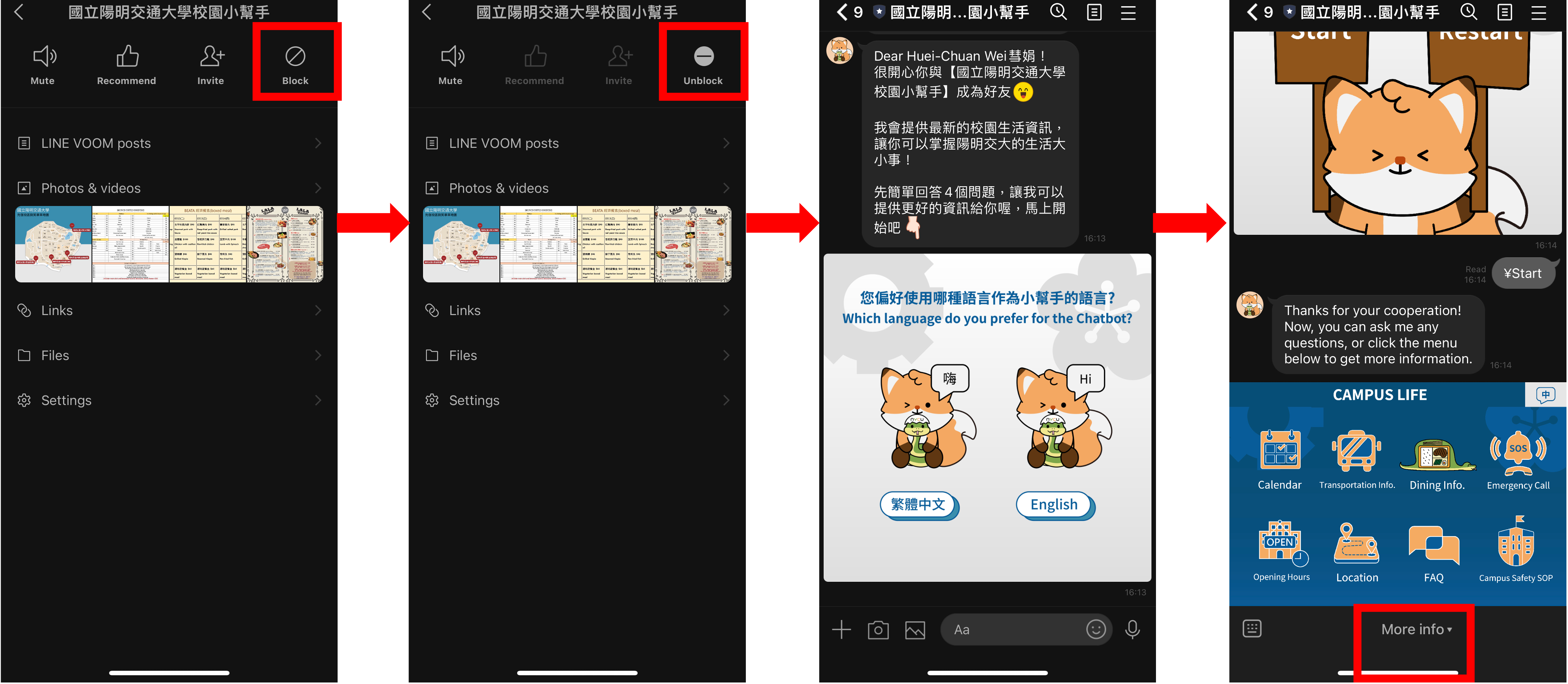 「校園小幫手」英文版建置於原本的校園小幫手,每一位使用者在加入此帳號時,即可選擇要使用中文版或英文版。考量外籍生與本籍生在校園資訊的需求有所不同,「校園小幫手」英文版提供的資訊主要以校園生活為主,包括「行事曆(Calendar)」、「交通資訊(TransportationInfo.)」、「學餐資訊(DiningInfo.)」、「緊急連絡電話(EmergencyCall)」、「場所營業時間(OpeningHours)」、「校園位置(Location)」、「常見問題(FAQ)」以及「校園安全緊急處理方式(CampusSafetySOP)」。未來,開發團隊仍會持續更新中英文校園小幫手,在功能使用以及資訊更新能夠更貼近全校教職員生的校園資訊需求。